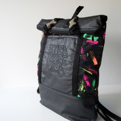 Su interior está acolchada (para que la mochila no pierda su forma), está forrada con tela de algodón negra y lleva un amplio bolsillo para que puedas guardar las cosas más importantes.