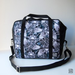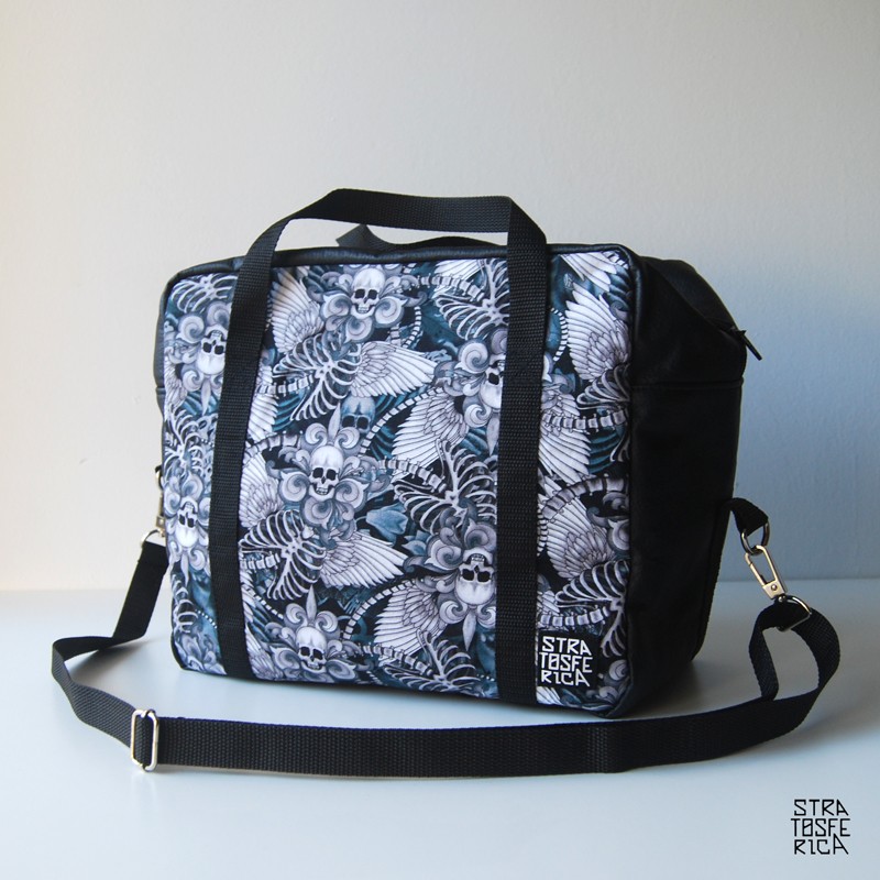 Bolso Calaveras con Alas. Realizado con tela 100% algodón (tejido suave) combinada con polipiel negra de alta calidad. Su interior está forrado con tela de algodón negra y lleva dos bolsillos interiores para que puedas guardar tus cosas. Sus medidas son 28X25 fuelle 18cm aprox. Tiene una correa ajustable de 1 metro para que lo puedas llevar al hombro o cruzado.